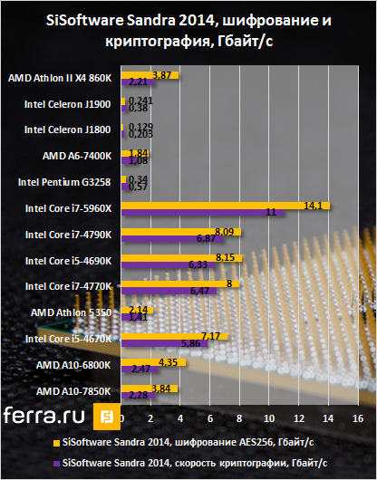 Athlon X4 860K также быстрее и названного конкурента — Intel Pentium G3258. Например, в тесте криптографии очень помогает поддержка соответствующего набора инструкций.
