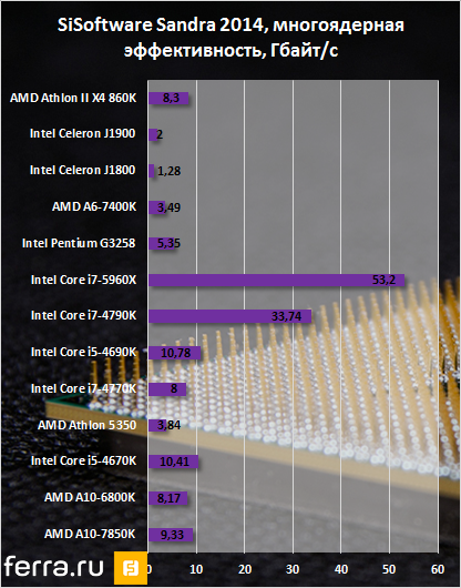 При практически идентичной стоимости Athlon X4 860K заметно, с двукратным преимуществом, опережает AMD A6-7400K в SiSoftware Sandra 2014. Сказывается наличие у гибридника всего одного модуля Steamroller и, соответственно, двух физических ядер.