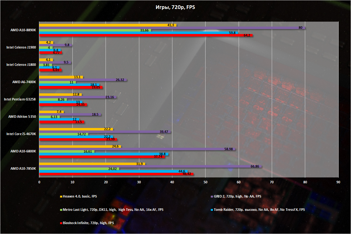 В большинстве современных игр многоядерность центрального процессора не играет весомой роли. Однако с распространением низкоуровневых API, таких как DirectX, Mantle и Vulkan, шесть физических ядер могут очень пригодиться. Плюс A10-8890K функционирует на довольно-таки высокой частоте (даже в номинальном режиме). Поэтому этот гибридный процессор без особых проблем справляется с производительными видеокартами. Наличие разблокированного множителя, а также встроенных 16 линий PCI Express 3.0 позволяет собрать на базе флагманского Carrizo действительно мощную систему с двумя топовыми графическими адаптерами.