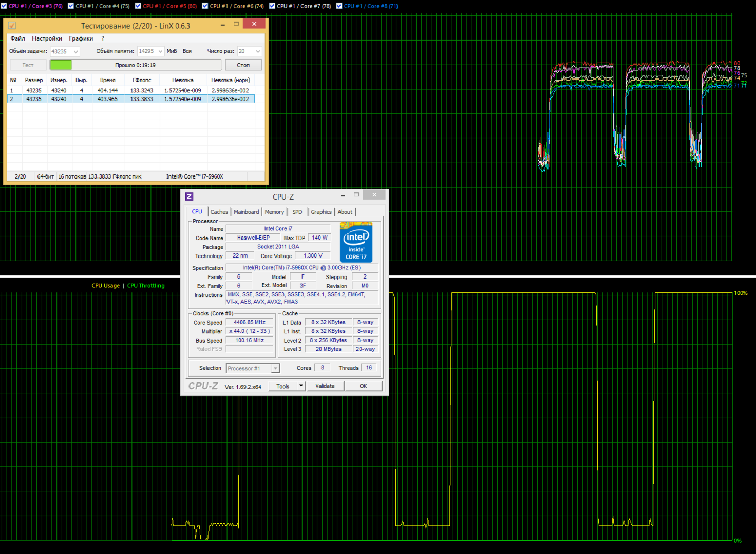 Как известно, максимальная температура, при которой не активируется троттлинг, у процессоров Intel Haswell находится на символичной отметке 100 градусов Цельсия. Исходя из нашего тестирования, у Core i7-5960X она заметно ниже. Так, при разгоне до 4600 МГц (VCore 1,4 В) «камень» троттлил до 4200 МГц (~25%), а максимальная температура одного из ядра достигла показателя 87 градусов Цельсия. Использовался процессорный кулер Noctua NH-D15, который, как известно, не из робкого десятка. 1,4 В — это много для Haswell. Не советую использовать такое напряжение в режиме 24/7, иначе «камень» очень быстро деградирует. Но такой уж попался процессор. Правда, при 4500 МГц система потребляла порядка 270 Вт энергии. А это уже очень прилично.