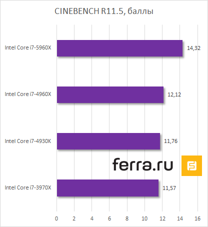 Синтетика любит многопоточность. Поэтому неудивительно, что стенд с Core i7-5960X на борту набрал наибольшее число баллов.