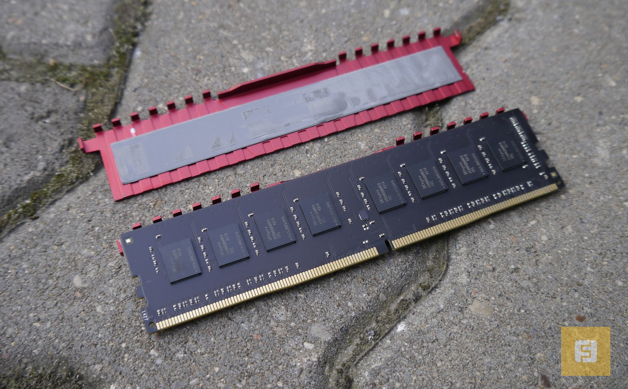 Объем одного модуля составляет 4 Гбайт. На планке распаяно восемь чипов. Следовательно, каждая микросхема имеет емкость 512 Мбайт. Используется продукция компании SK Hynix, маркировка — H5AN4G8NMFR.