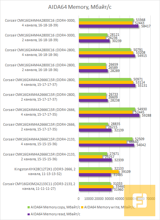 Повторюсь, результаты тестирования оказались вполне предсказуемыми. В AIDA64 DDR3 в двухканальном режиме работает быстрее. Сказывается наличие более низких таймингов. Однако отставание небольшое. Поэтому вряд ли Core i7-5960X много теряет. Тем более, что есть поддержка 4-канального режима.