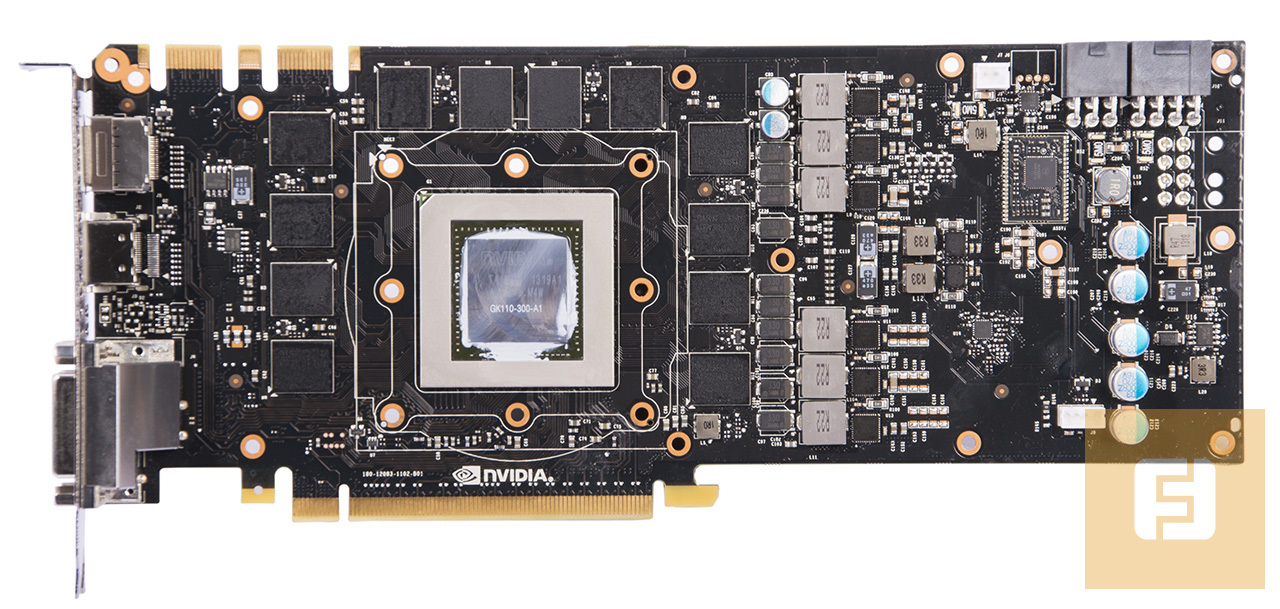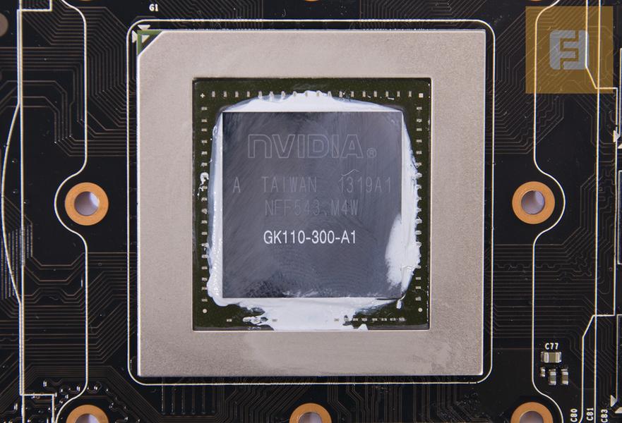 Видеочипы также ничем особенным не отличаются. Сняв охлаждение, мы видим процессор GK110. Система питания — 6-фазная.