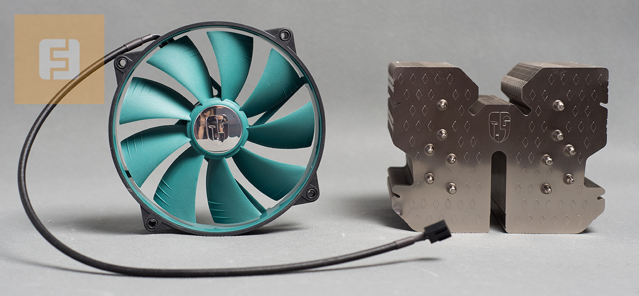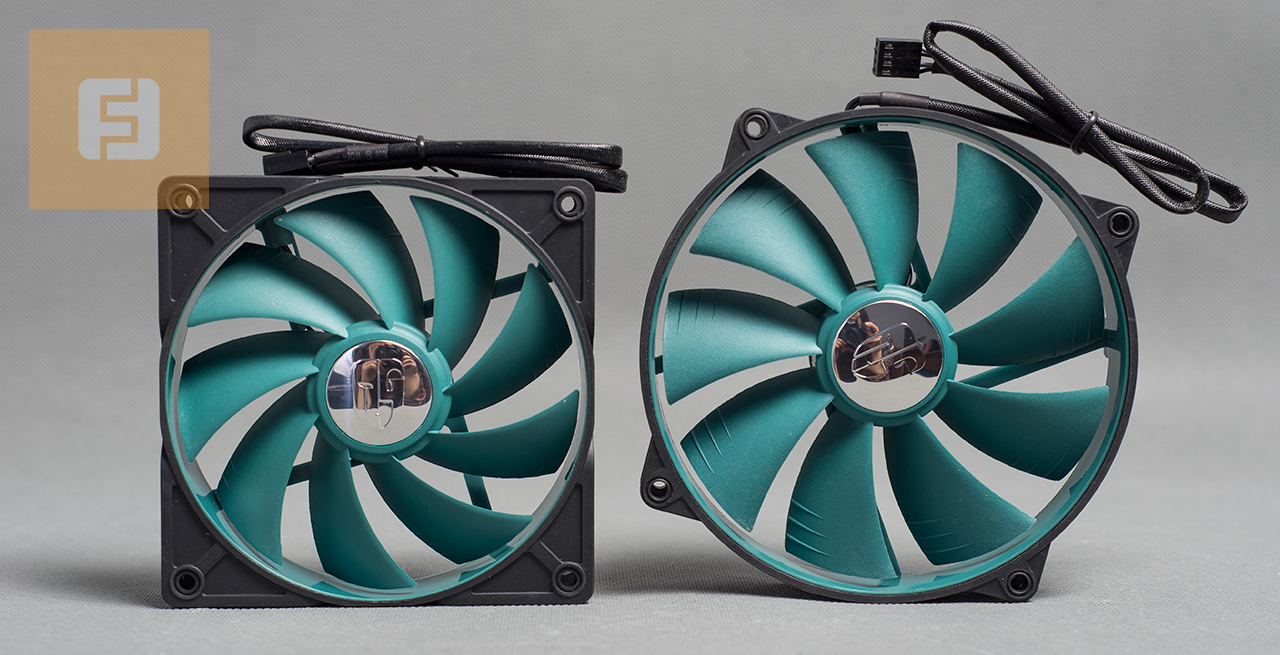 В комплекте с Assassin идут два вентилятора: UF140 и UF120. Обе крыльчатки имеют черную оправу и мятного цвета лопасти. В основе вентиляторов DeepCool лежат гидродинамические подшипники. Первый «карлсон» (с PWM-управлением) может работать в диапазоне от 700 до 1400 об/мин. Второй не имеет ШИМ’а, поэтому вращается в заданном режиме со скоростью 1200 об/мин, образует воздушный поток 52.35 CFM и уровень шума 23.2 дБ.