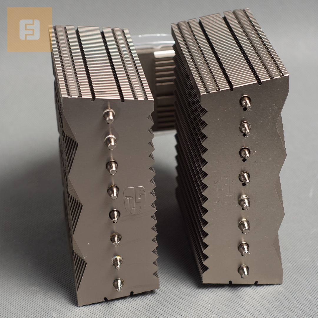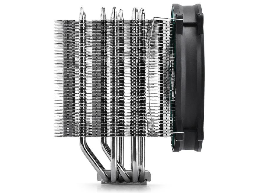 Конструкция радиатора состоит из шести медных теплотрубок, на которые нанизаны 36 алюминиевых пластин толщиной 0,5 мм. Расстояние между ними составляет 2,7 мм. Тепловые трубки диаметром 6 мм сконцентрированы в центральной части металлических пластин и припаяны к медному никелированному основанию. Подобный конструкторский ход тяжело назвать удачным, поскольку остальная поверхность пластин остаётся пустой. Пайка между теплотрубками и пластинами отсутствует, что снижает контакт между ними.
