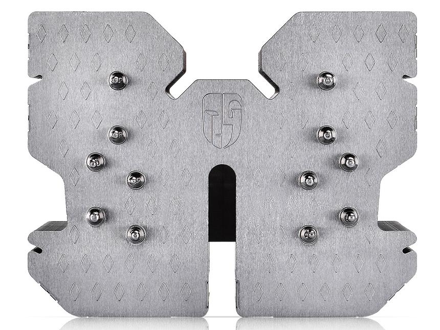 Радиатор нашего «наёмного убийцы» имеет форму пирамиды, разделенной на две секции. Они соединяются вместе в нижней части конструкции с помощью восьми никелированных теплотрубок толщиной 6 мм. А они в свою очередь присоединены методом опрессовки к медному основанию, на которое надета защитная пластиковая крышка. Обе секции радиатора в сумме несут на себе 98 алюминиевых пластин толщиной 0,5 мм, межрёберное расстояние составляет 2 мм.