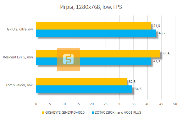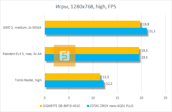 От младшей модификации встроенной графики Intel не стоит ожидать серьёзного игрового потенциала. И всё же производительность видеочипа на минимальной детализации при разрешении HD позволяет скоротать время до пересадки за более производительный ПК. А большего от миниатюрного «диванно-мультимедийного» неттопа и не требуется. Кстати, здесь неттоп на базе логики AMD показал себя ничуть не хуже противника.