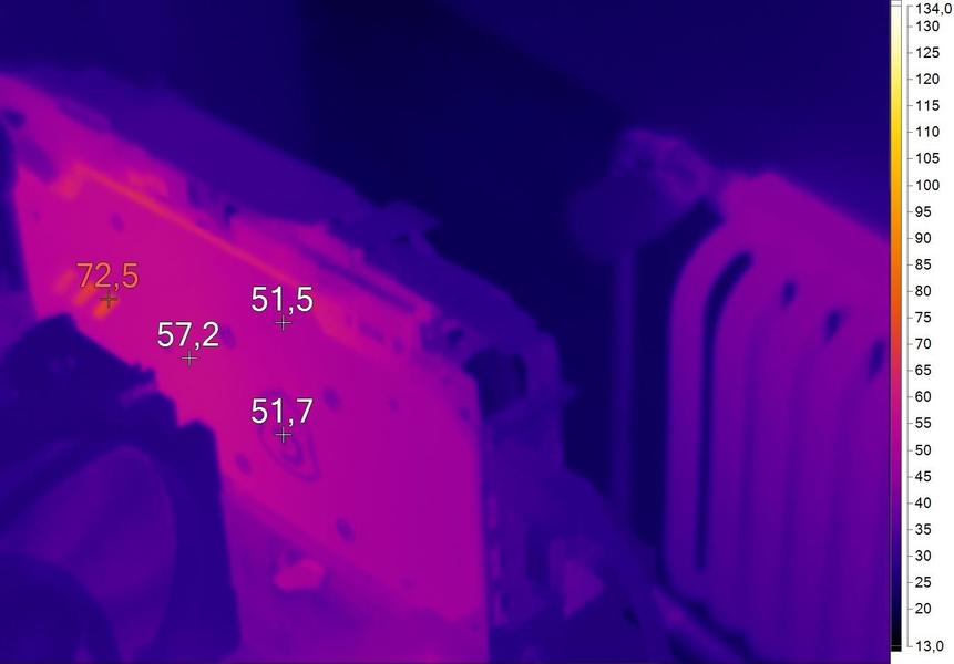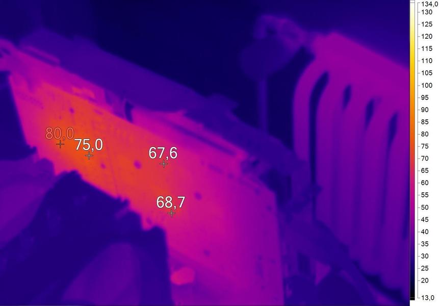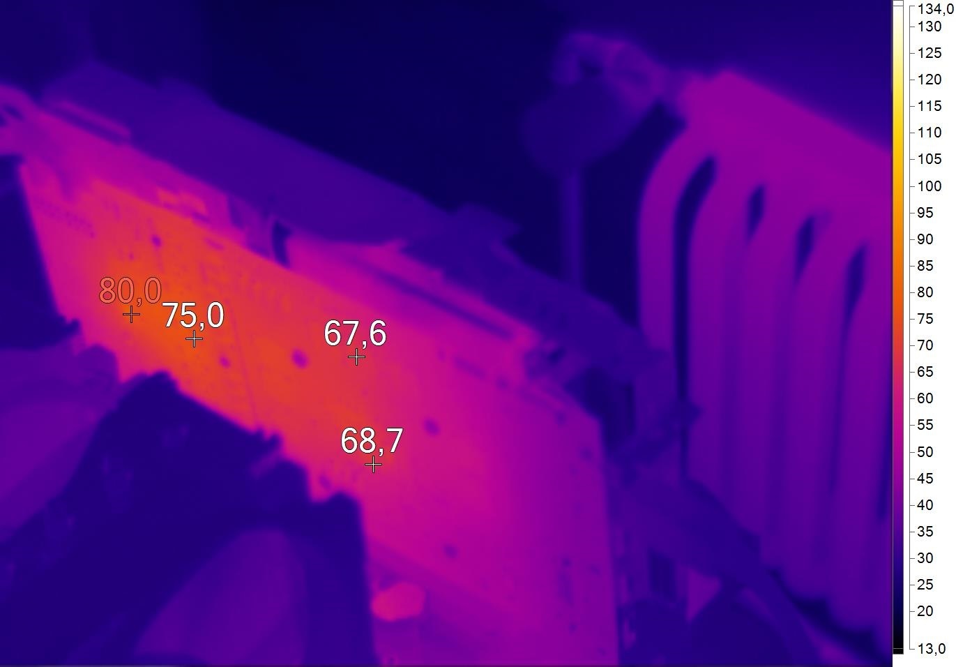 Не так давно компания EVGA отозвала часть своих GeForce GTX 1070 из-за того, что подсистема питания видеокарты очень сильно грелась. Под нагрузкой VRM-зона «уходила» за 100 градусов Цельсия. GeForce GTX 1070 Xtreme Gaming, несмотря на приличный разгон чипа и памяти, оказалась холодной. Я специально снял бекплейт, хоть он и является частью системы охлаждения. Час FurMark, но самое горячее место (подсистема питания) прогрелось всего до 80 градусов Цельсия. Для GeForce GTX 1070 — это хороший результат.