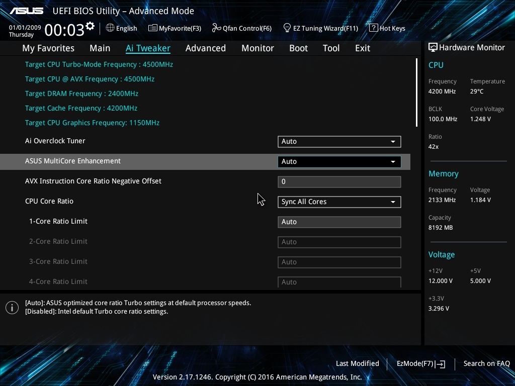 В плане функциональности PRIME Z270-A и STRIX Z270E GAMING имеют одинаковые прошивки BIOS. Только скины разные. Каталогизация, эргономика и опции практически не изменились по сравнению с той же Z170 PRO GAMING. Из полезных фич добавилась возможность регулировать множитель для приложений, использующих инструкции AVX. Впервые такая функция появилось в процессорах Broadwell-E.