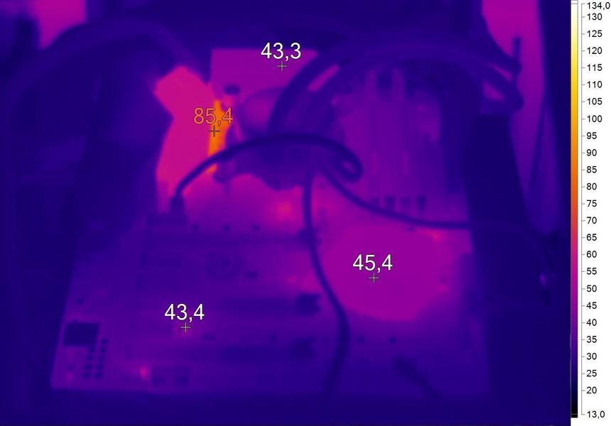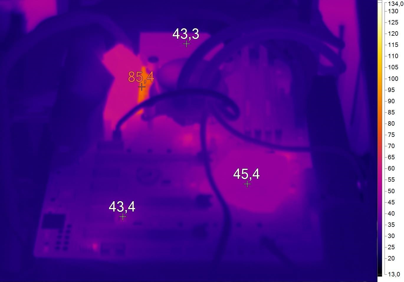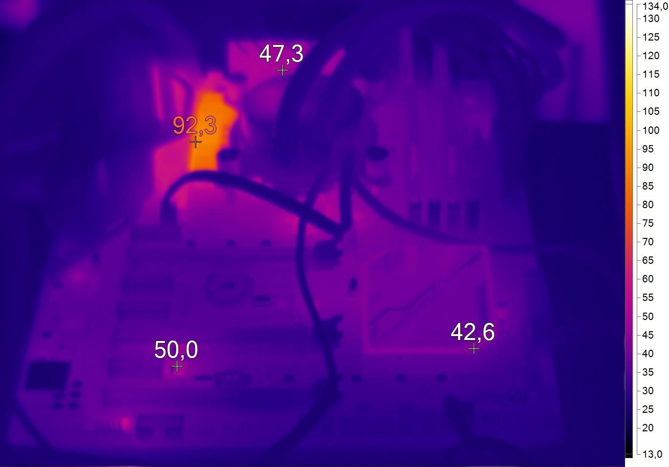 В разгоне, под нагрузкой, подсистема питания PRIME Z270-A заметно греется — до 96 градусов Цельсия после получаса LinX 0.7.0. «Пациент» жить будет, но хотелось бы более «спокойных» температур. Учитываем, что для тестирования матплат специально используется СВО. С применением воздушного кулера элементы питания будут дополнительно обдуваться. Особенно с системой типа Down Flow. И все же без хорошей циркуляции воздуха в корпусе не обойтись.