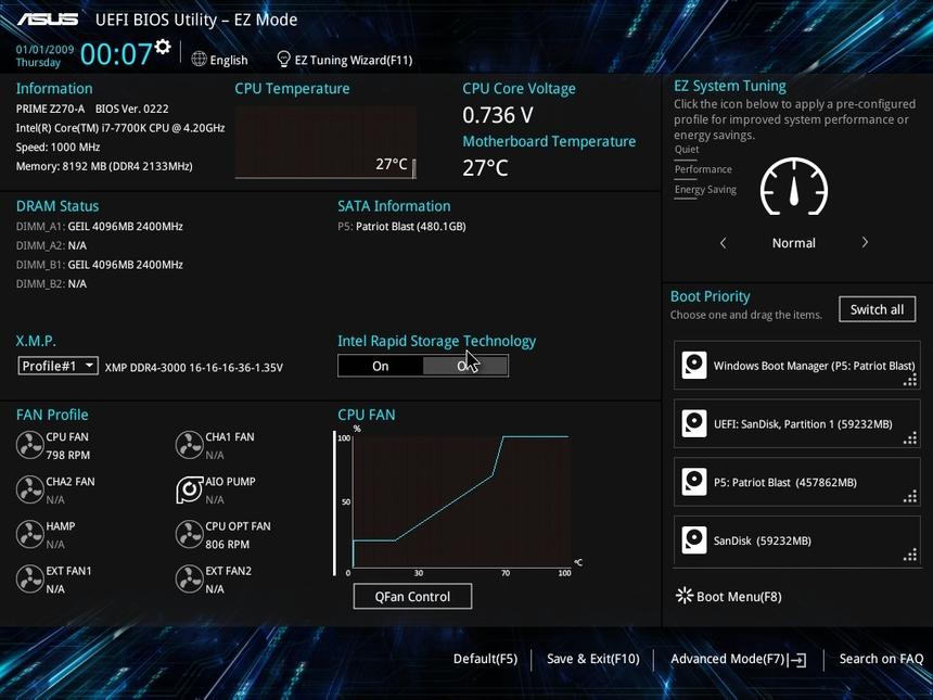 Kaby Lake с литерой «К» в названии можно оверклокнуть в том числе и по шине. Появятся ли для плат на чипсете Z270 Express специальные прошивки, позволяющие разгонять и прочие Core седьмого поколения, я не знаю. Надеюсь, что все будет. Но PRIME Z270-A и ASUS STRIX Z270E GAMING демонстрируют отличные результаты. Первая разогналась до 240 МГц, вторая — до 290 МГц. Такого оверклока достаточно для того, чтобы, например, разогнать Core i5-6400 с 2700 МГц до 240х27=6480 МГц. Но, повторюсь, все зависит от появления соответствующих версий BIOS. Держим кулаки.