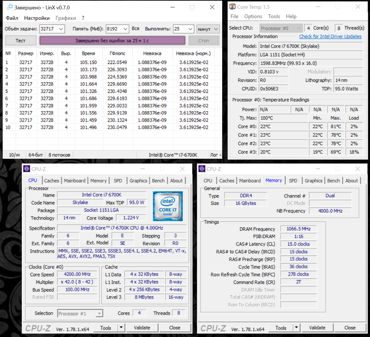 | Температура ядер, °C, LinX 0.7.0, 25 мин | ||||||