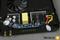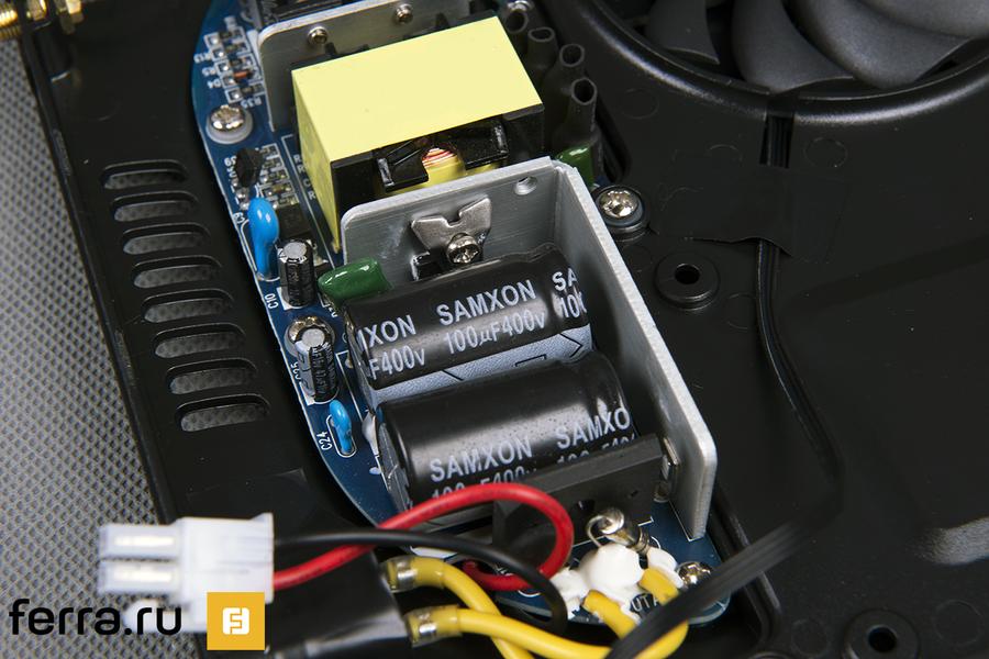 Самая «мякотка» DNK-H — это, конечно, встроенный блок питания мощностью 150 Вт. Выполнен он на небольшой печатной плате. Форма текстолита подогнана под «округлости» корпуса. Внешнего кожуха нет. Так все элементы лучше охлаждаются. Горячие полевые транзисторы охлаждаются Г-образными алюминиевыми радиаторами. Конденсаторы произведены компанией Samxon. Они рассчитаны на работу при температуре вплоть до 105 градусов Цельсия.