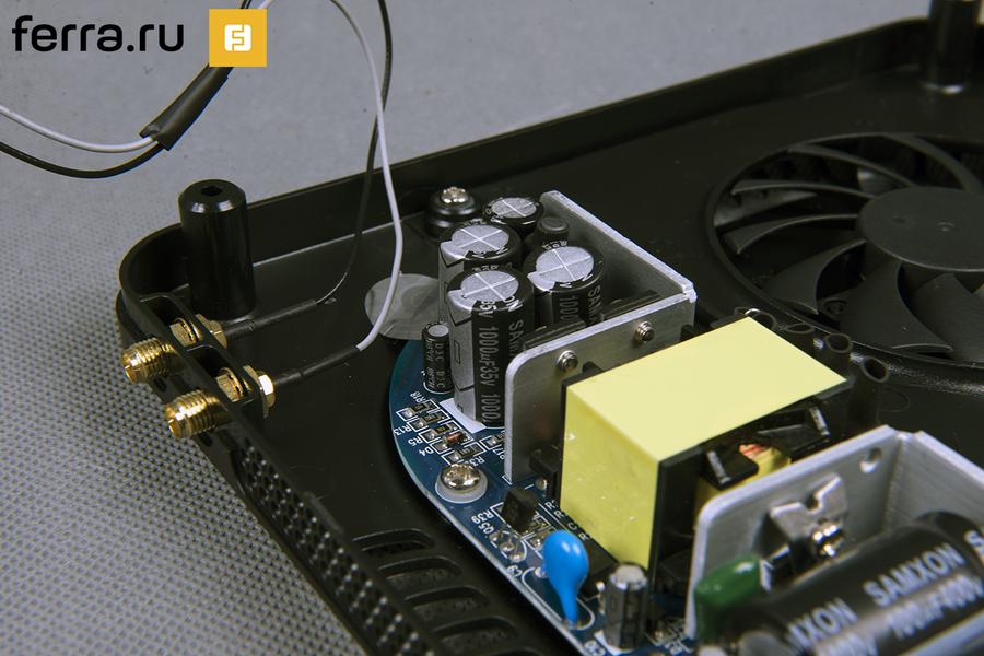 Разъемы для подключения Wi-Fi-антенн выведены отдельно. Двухпиновый коннектор питания —тоже. Здесь же, на задней панели, расположен воздухозаборник. С его помощью охлаждаются элементы встроенного блока питания.
