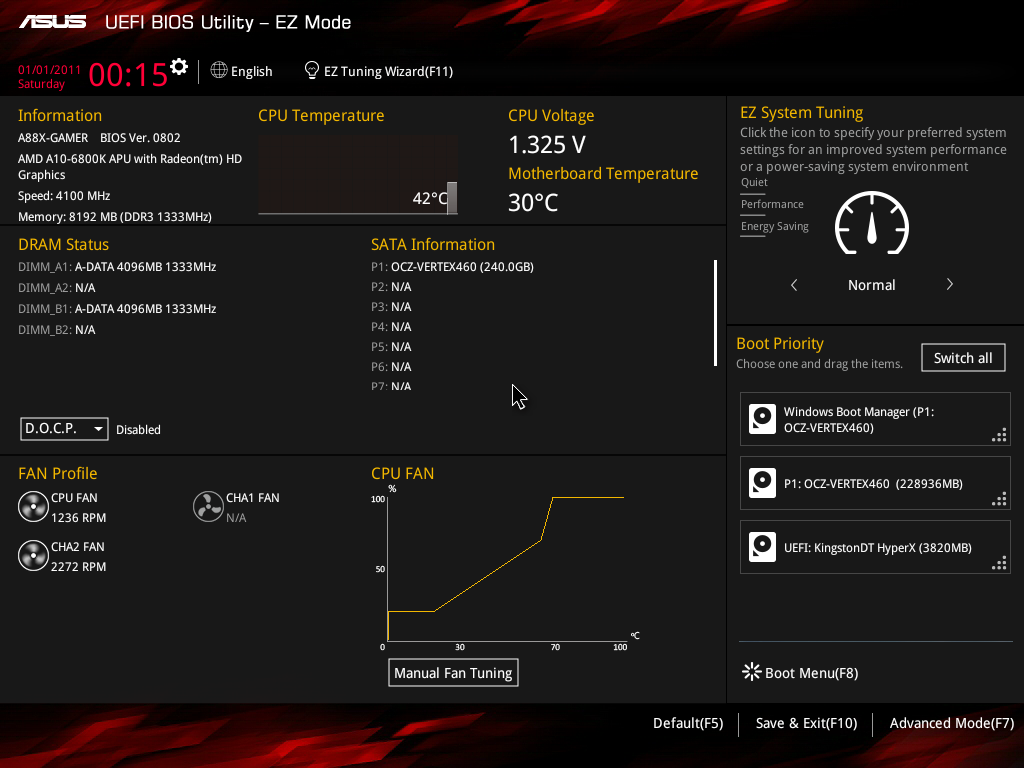 • Нет вкладки Extreme Tweaking. Хотя для A88X-GAMER реализованы некоторые из функций DIGI+ VRM.