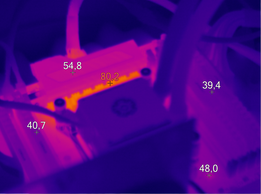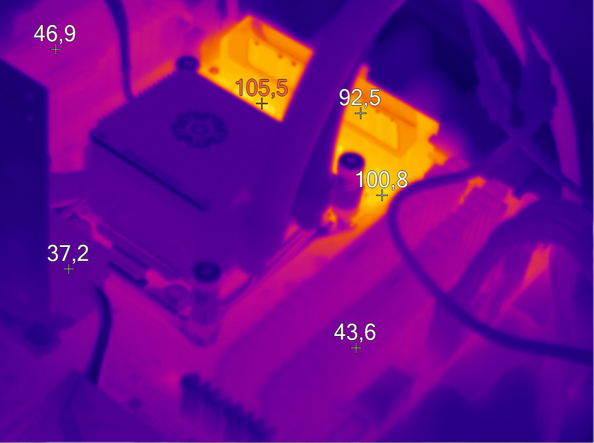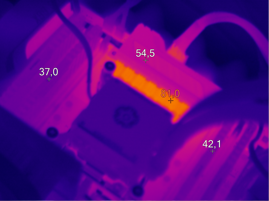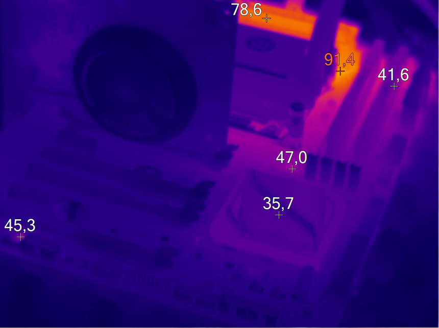 А вот наличие дополнительного элемента охлаждения в виде медной теплотрубки у X99-S позволило значительно снизить температуру околосокетного пространства. Максимальный зафиксированный показатель — 81 градус Цельсия.