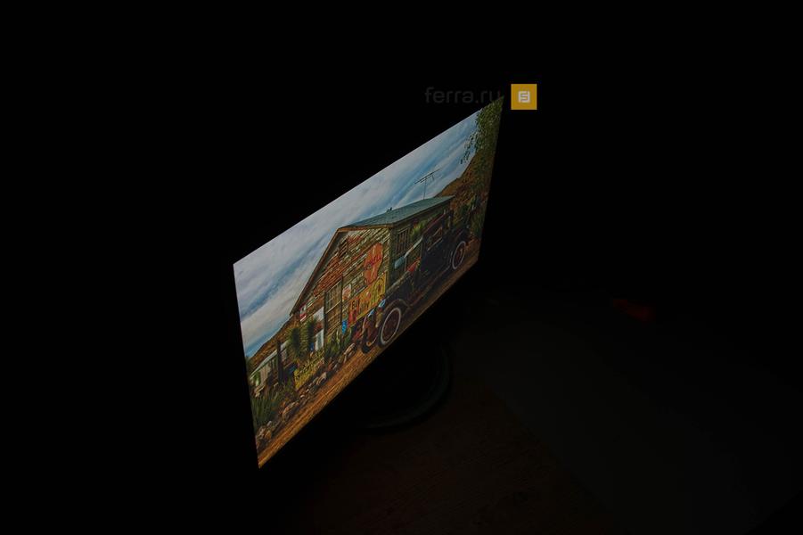 Теперь посмотрим на фотографии монитора в тёмном помещении. На фотографии с белым фоном не сильно, но всё же заметно, что по центру и на нижнем краю экрана интенсивность подсветки немного выше, чем в остальных областях. На чёрном фоне видно только одну область засветки — левый нижний край. Выглядит это гораздо лучше, чем у iiyama ProLite XB2779QS. Заметно меньше у AOC q2770Pqu и glow-эффект.