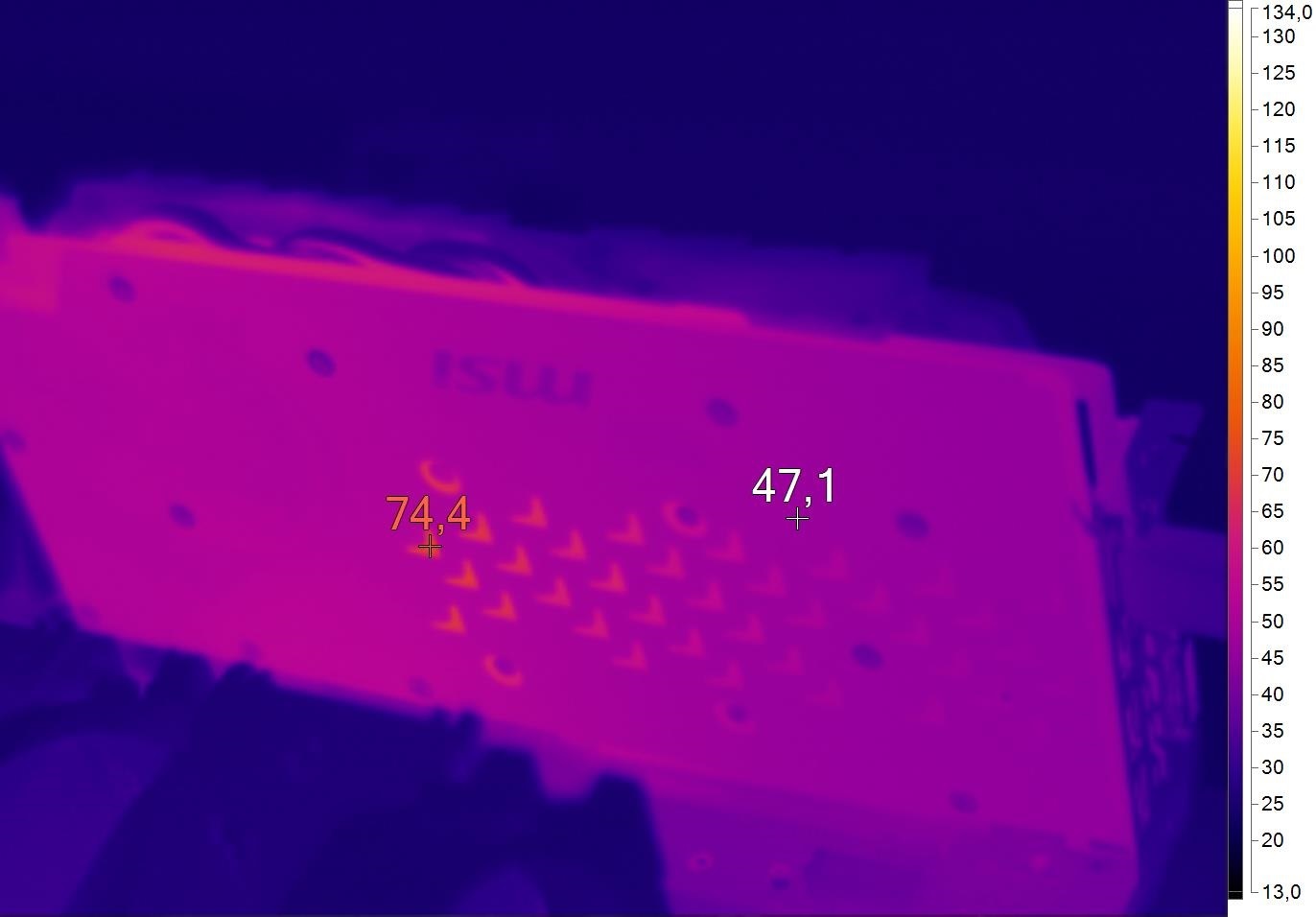 Самым горячим местом на плате является подсистема питания. Со стороны выводов она прогревается до 82 градусов Цельсия. Референс «отжигает» заметно . Только не забывайте, что у GeForce GTX 1060 GAMING X 6G есть металлический бекплейт. Он не дает высоким температурам греть расположенные по соседству комплектующие.