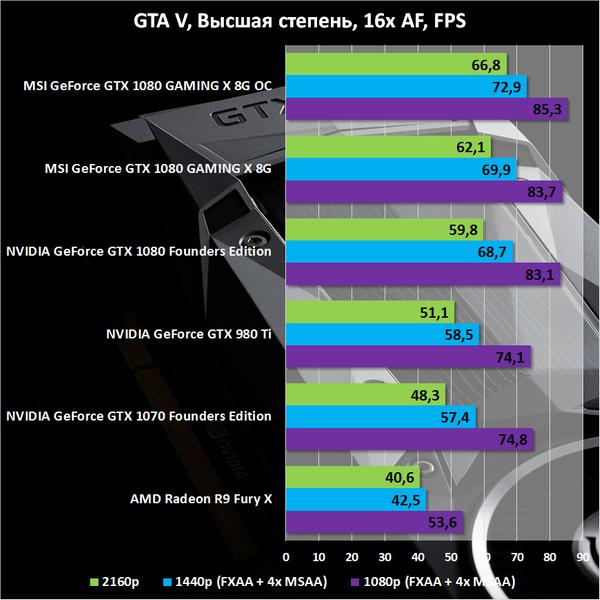 С подробным тестированием GeForce GTX 1080 можете ознакомиться в этой статье. Там больше 20 игр, включая DirectX 12. Очевидно, что разницу в производительности между Founders Edition и GeForce GTX 1080 GAMING X 8G обеспечивают частоты. У кастома они выше. Ниже приведены результаты тестирования в GTA V и «Ведьмак 3: Дикая Охота». Кстати, в этих играх толк от разгона заметен сильнее.
