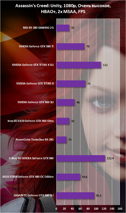 А теперь посмотрите вверх. Здесь (в Assassin’s Creed Unity) у кастома от MSI абсолютный паритет с нереференсом от Inno3D в Full HD и отставание на 11,7% в WQHD. А вот Radeon R9 285 отстает от R9 380 GAMING 2G на 28% в 1080p. Видимо, сказались как обновления самой игры, так и выход новых версий драйверов.