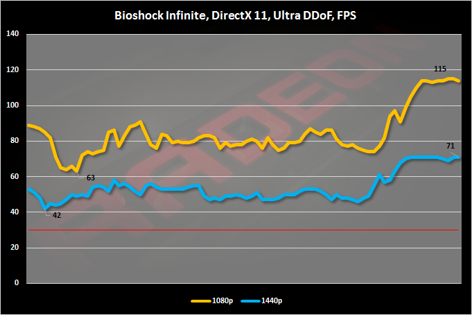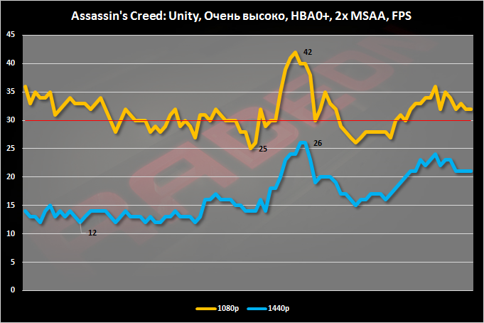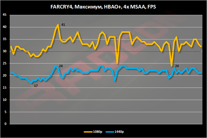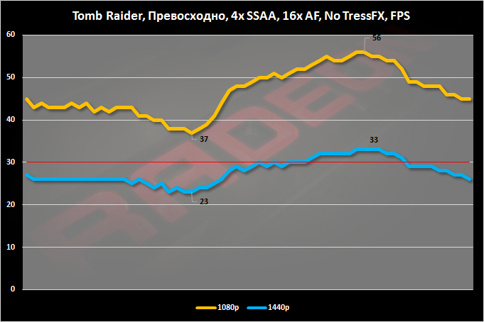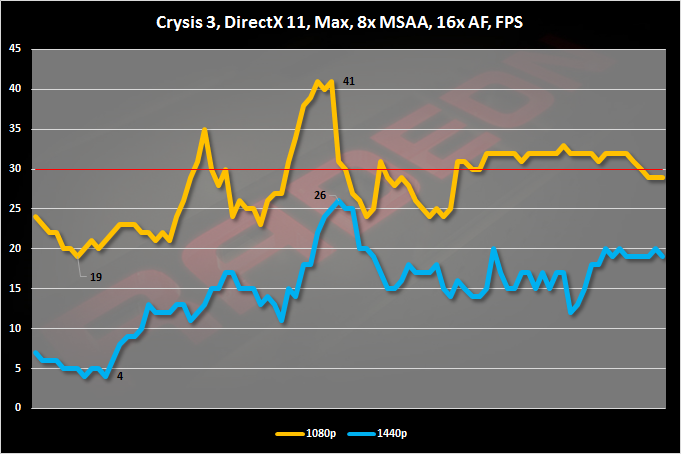 Новые драйверы и увеличенная частота GPU дали свои плоды. При заданных нами настройках качества графики уровень FPS в разрешении Full HD можно признать условно играбельным. Минимальный показатель кадров равен 25. В WQHD-разрешении FPS проседает заметно сильнее.