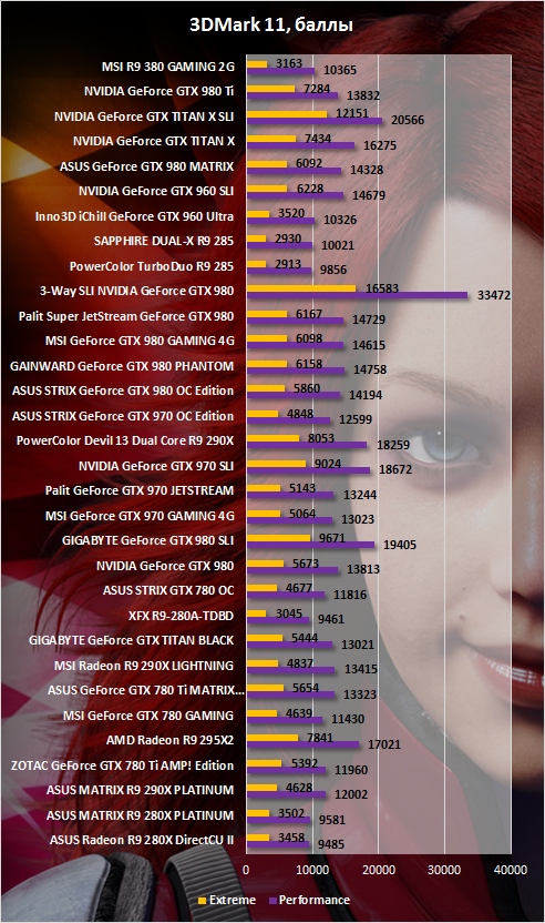 3DMark 11, режим Extreme — здесь у R9 380 GAMING 2G 3163 балла супротив 3520 «попугаев» у кастомизированной версии GeForce GTX 960 от Inno3D и 2913 очков у разогнанной модификации Radeon R9 285 от PowerColor. Разница составила -10% и +8,5% соответственно. В 3DMark Fire Strike (режим Extreme) R9 380 GAMING 2G оказалась быстрее GeForce GTX 960 на 9% и Radeon R9 285 на 8%.