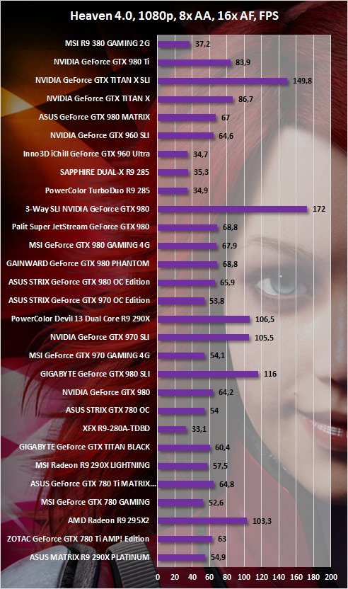 В Heaven при максимальных настройках качества графики результаты следующие: R9 380 GAMING 2G быстрее Inno3D GeForce GTX 960 на 7,2% (Full HD) и на 13% (WQHD) и производительнее Radeon R9 285 на 6,6% (Full HD) и 7,1% (WQHD) соответственно.