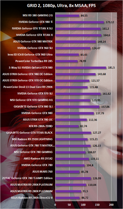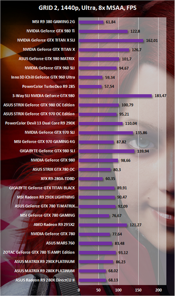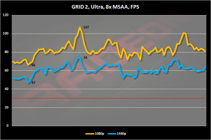 Far Cry 4 тоже относится к когорте ресурсоемких игр современности. В Full HD она серьезно нагрузила испытуемую видеокарту. В WQHD — перегрузила. А вот GRID 2, хоть это и не отображено на графике, с R9 380 GAMING 2G продемонстрирует вполне играбельный FPS и в Ultra HD разрешении.