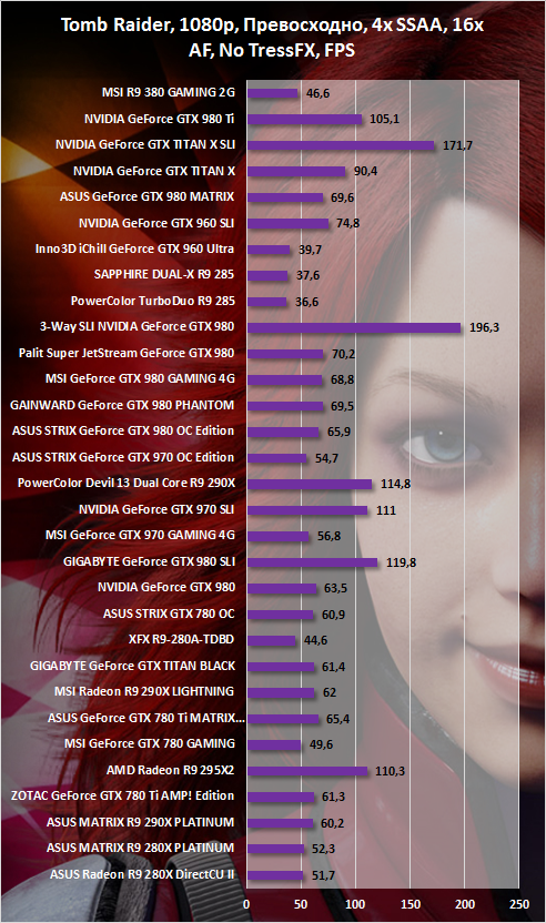Убираем эффекты сглаживания и наслаждаемся вполне играбельным количеством кадров в секунду в Tomb Raider в WQHD. То же самое касается и «Ведьмака».