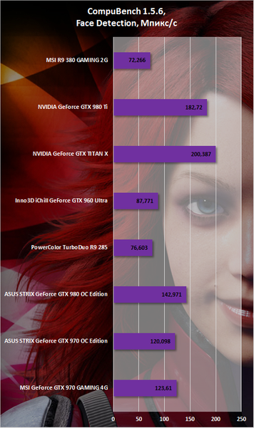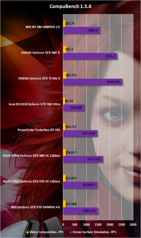В приложениях, связанных с вычислениями, наблюдается та же тенденция. В большинстве тестов R9 380 GAMING 2G оказалась чуть впереди и Inno3D iChill GeForce GTX 960 Ultra, и PowerColor TurboDuo R9 285.