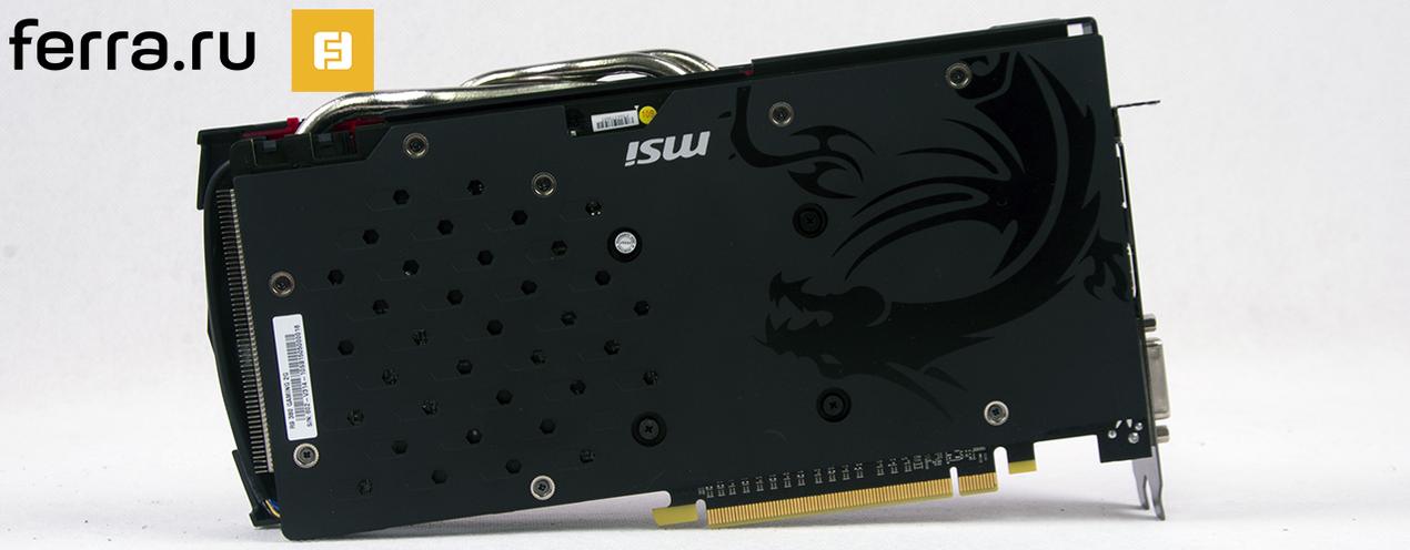 Оборотная сторона полностью прикрыта массивным бекплейтом. Например, кастомная версия GTX 960 GAMING 2G не имеет такого элемента в своей конструкции.