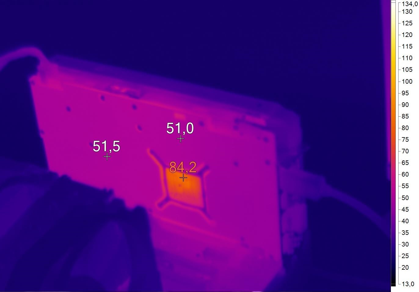 Если снять бекплейт, то мы увидим, что Premium Edition греется с обратной стороны сильнее всех. Самое горячее место расположено как раз в районе GPU. Впрочем, температуры находятся в рамках приличия. 84 градуса Цельсия — вообще несмертельный показатель.