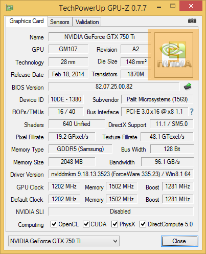 Хоть Palit GeForce GTX 750 Ti и является разогнанной версией, но китайским инженерам удалось уложиться в номинальный термопакет 60 Вт. Связано это в первую очередь с применением энергосберегающей технологии Power Saving GTX, а также с использованием усовершенствованного ШИМ-контроллера вкупе с полевыми транзисторами цепи питания.