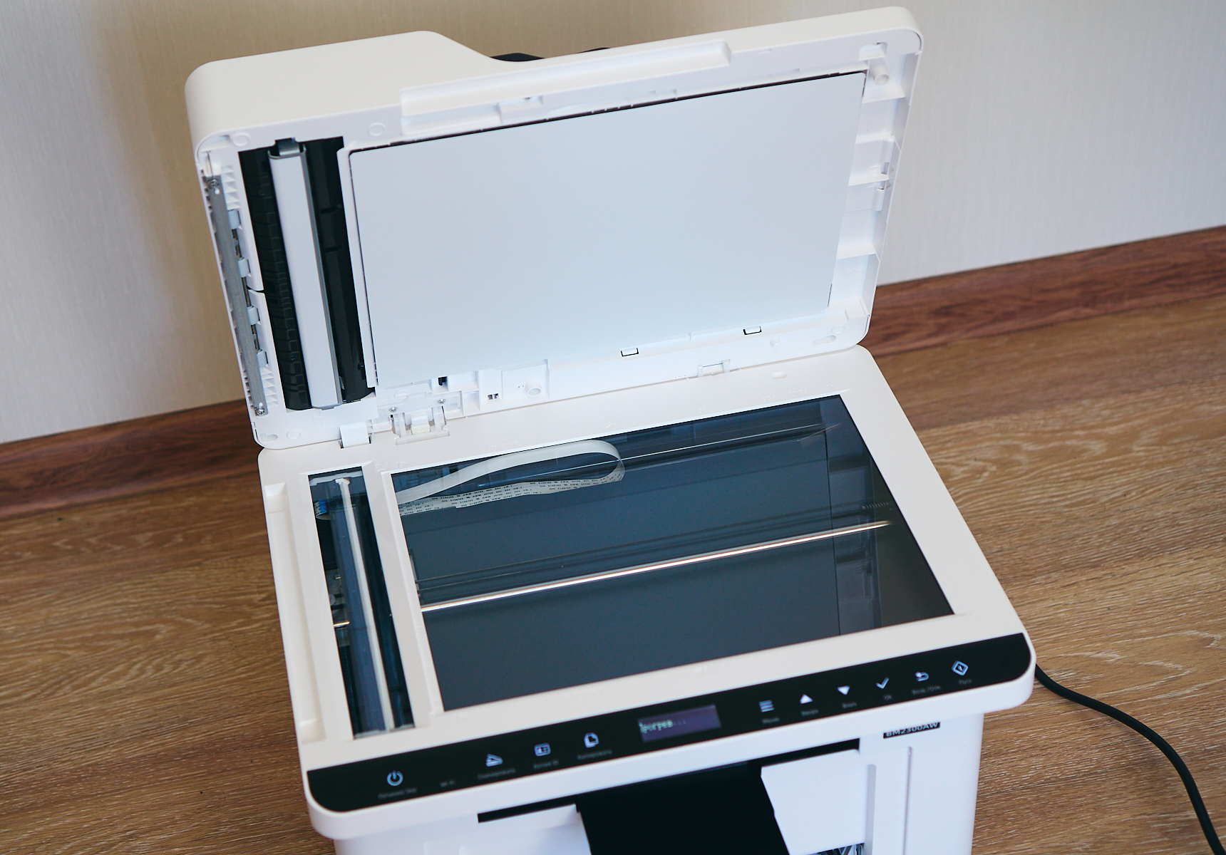 Сразу под сканером находится панель управления — на ней сенсорные кнопки и посередине небольшой экран, на котором помещается буквально две строчки текста. Но в принципе этого экранчика достаточно, чтобы настраивать принтер и выполнять то же сканирование, например.