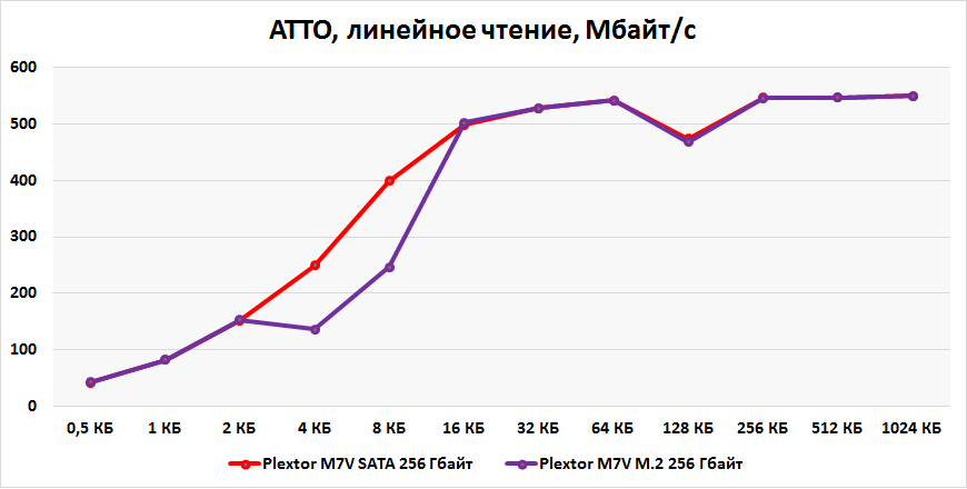 По традиции начнем с бенчмарка ATTO. Его очень любят не только тестеры, но и сами производители, так как программа показывает столь приятное глазу пиковое быстродействие. Как видите, максимальные показатели моделей M7V близки к заявленным. Указано 560/530 Мбайт/с для операций линейных чтения/записи, софт зафиксировал 550/528 Мбайт/с. Настораживает, что в обоих случаях наблюдаются перепады. Особенно это ощущается в операциях записи крупных блоков.