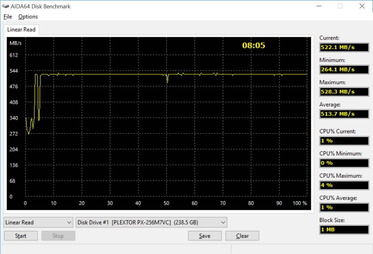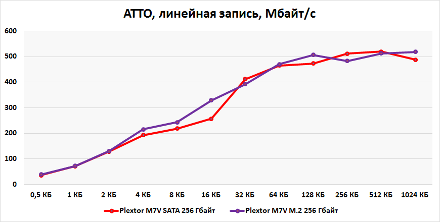 Второй интересный момент работы накопителей касается линейного чтения. В бенчмарке ATTO мы уже столкнулись с нелогичными просадками на блоках большого объема. Судя по графику AIDA64, накопителям требуется определенное время для разгона, так как при чтении видны колебания с просадками до 260 Мбайт/с. После 5% чтения M7V выходят на стабильное быстродействие 500+ Мбайт/с. Аналогичное поведение наблюдается на обоих устройствах во всех бенчмарках. Тенденция, однако.