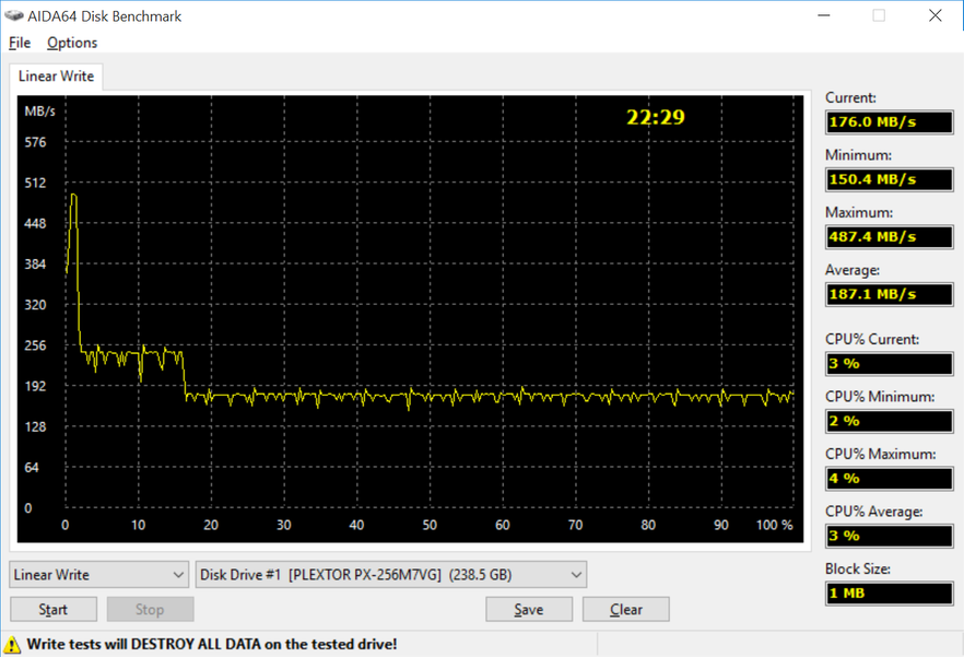 Как и любой другой накопитель на TLC-памяти, M7V быстр ровно до тех пор, пока не израсходован SLC-кэш. Plextor данную технологию называет PlexNitro, Samsung — TurboWrite, однако принцип работы у нее всегда одинаков. Для 256-гигабайтного SSD этот объем составляет приблизительно 4 Гбайт. Затем скорость записи заметно снижается. Впрочем, полученные 240 Мбайт/с — это все равно хороший результат, так как, например, Patriot Blast . С другой стороны, у M7V во время записи постоянно наблюдаются провалы до 190 Мбайт/с, поэтому я не рекомендую использовать такие SSD для создания RAID-массивов.