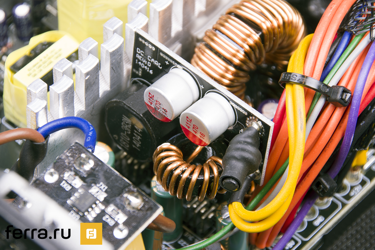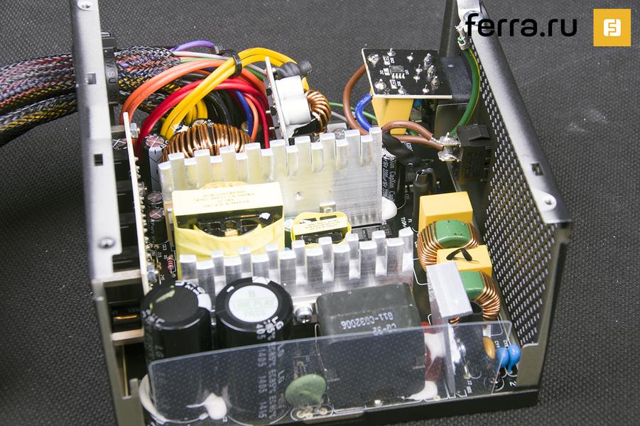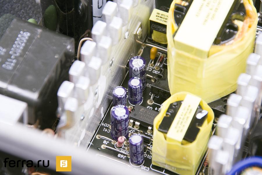 Конденсаторы высоковольтной цепи выпущены компанией LG. Один имеет емкость 330 мкФ (400 В), второй — 270 мкФ (400 В). Конденсаторы подключены параллельно. В итоге суммарная емкость для 750-ваттного блока составляет целых 600 мкФ. К сожалению, максимальная рабочая температура элементов составляет всего 85 градусов Цельсия.