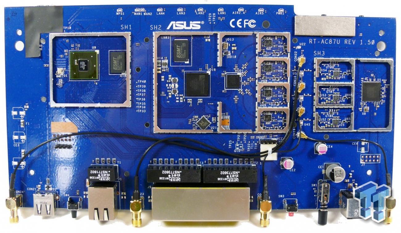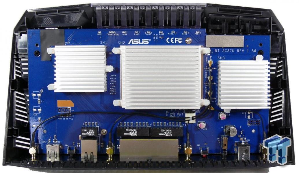 Печатная плата RT-AC87U выполнена достаточно грамотно. Основные компоненты устройства разделены на три секции, каждая из которых охлаждается отдельным алюминиевым радиатором. За все время тестирования я не обнаружил каких-либо проблем, связанных с перегревом или нестабильной работой системы.