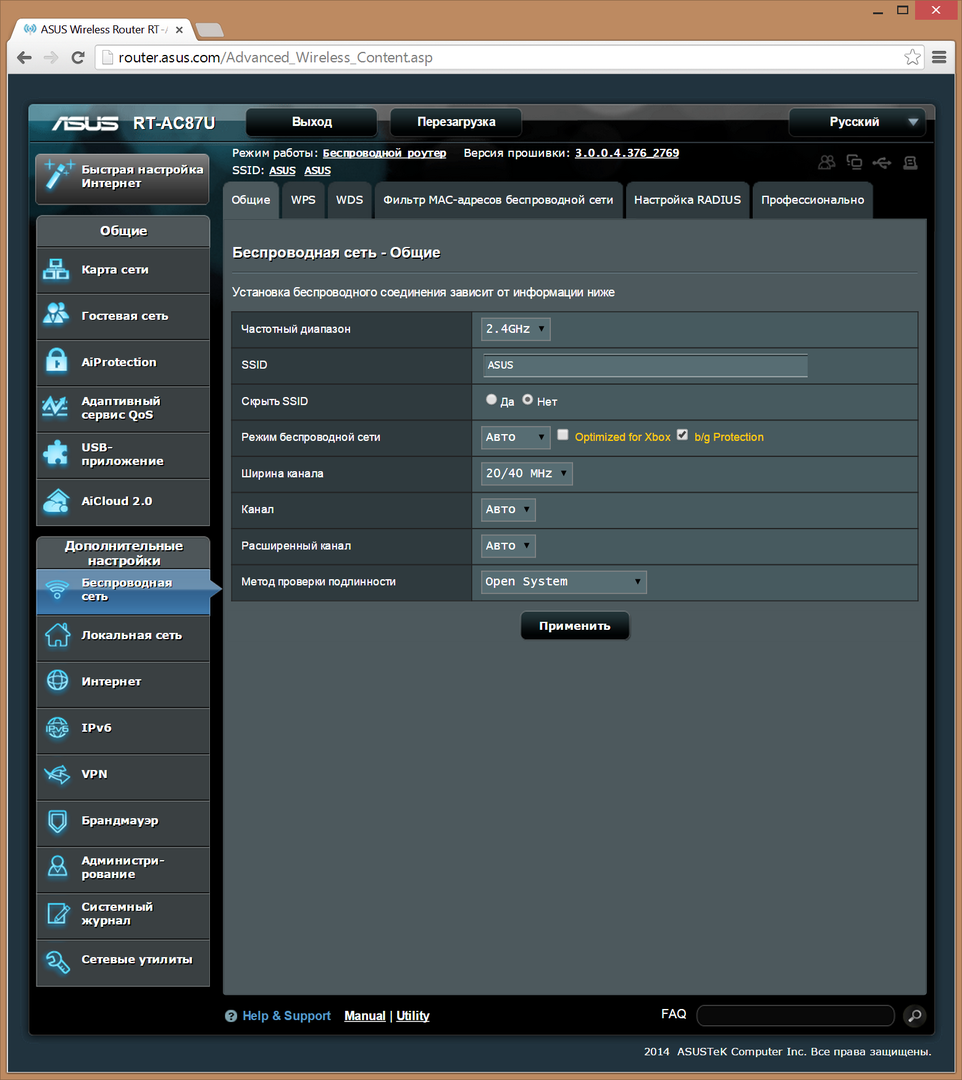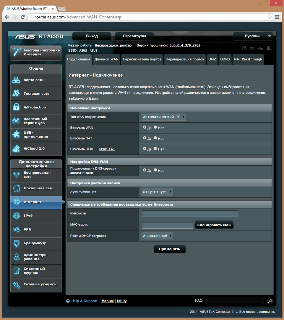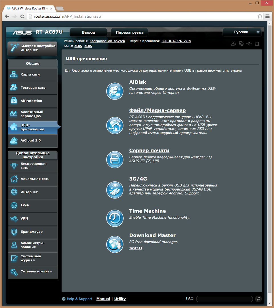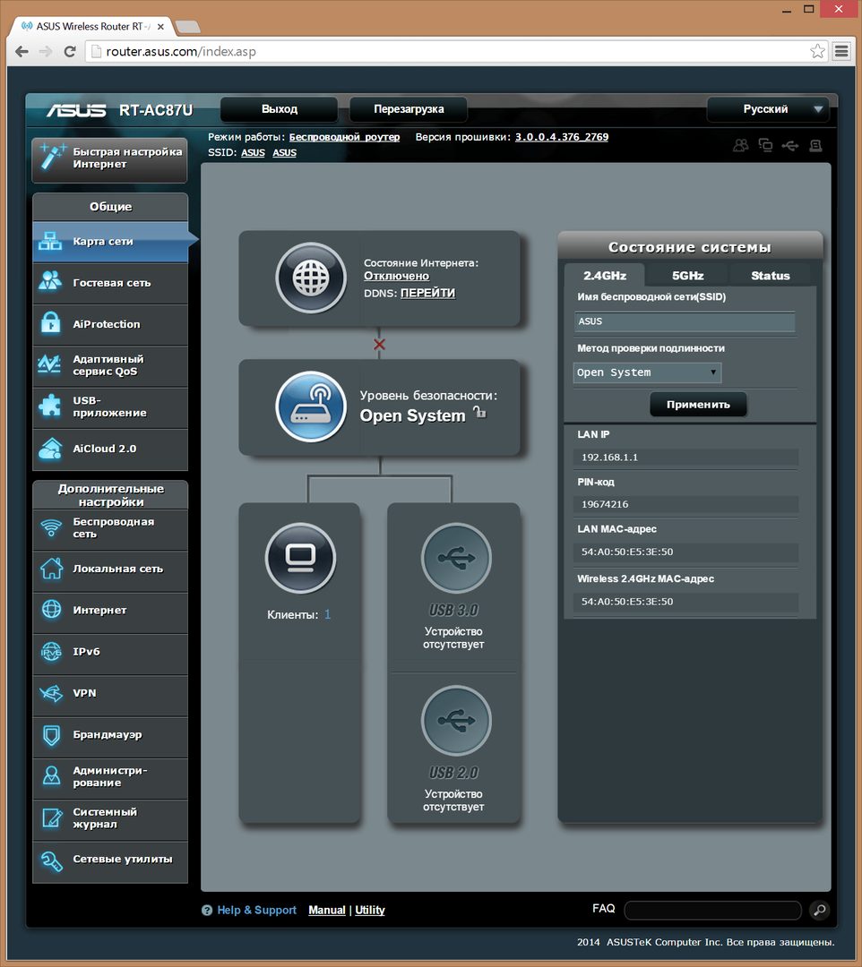Прошивка всех маршрутизаторов ASUS имеет идентичный дизайн, а также универсальную структуру. С веб-интерфейсом роутеров тайваньской компании вы могли детально познакомиться в обзорах RT-AC68U и RT-AC52U. Поэтому я не буду детально рассматривать каждую функцию, но расскажу про основные возможности. На момент тестирования устройства актуальной считалась прошивка под номером 3.0.0.4.376_2769. Уровень локализации операционной системы на Великий и Могучий можно охарактеризовать как хороший. Хотя есть места, непереведенные на русский язык.