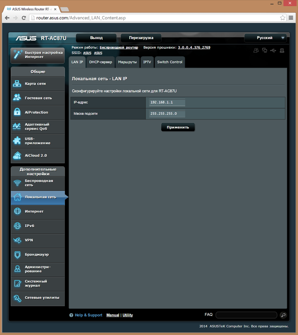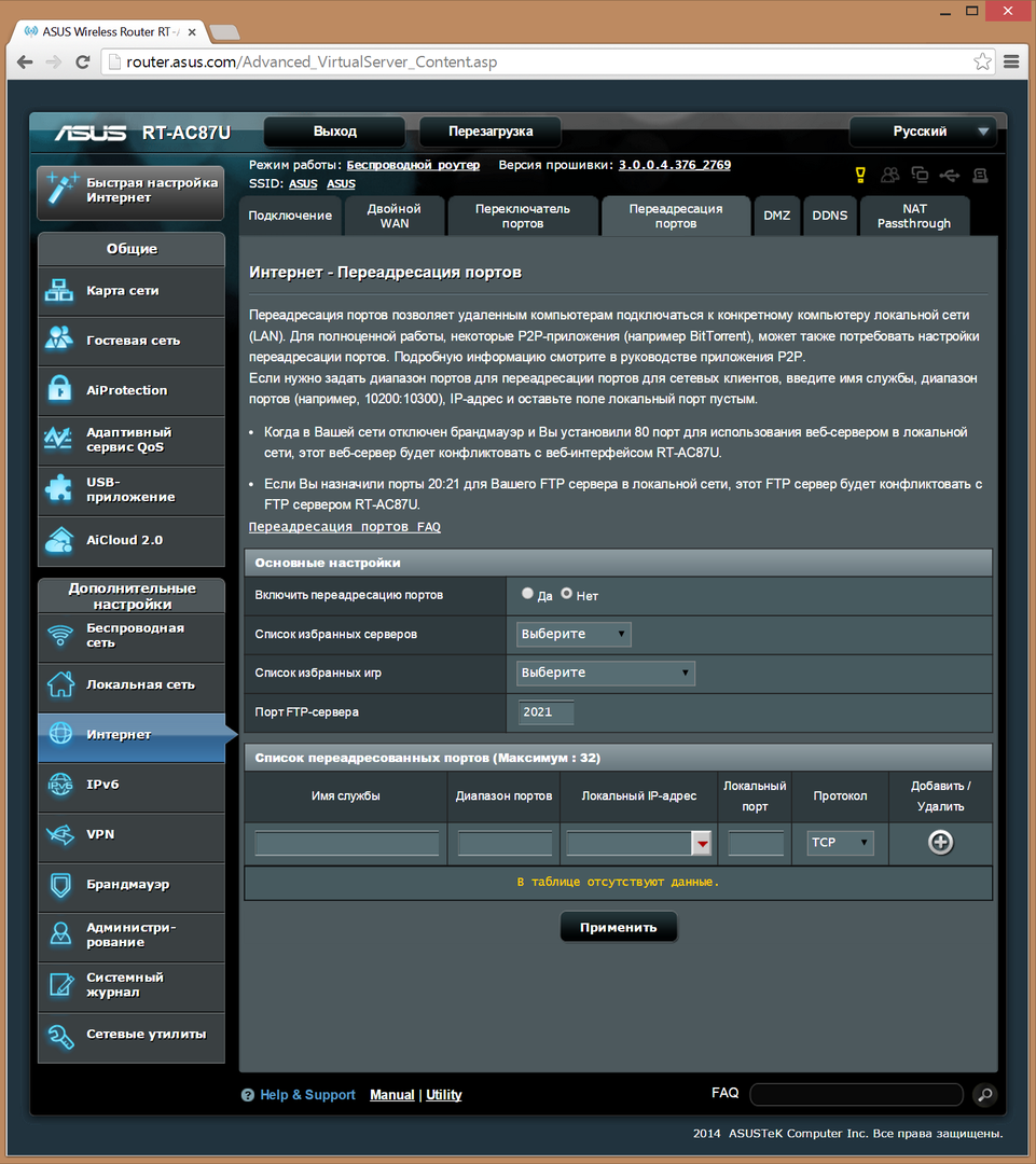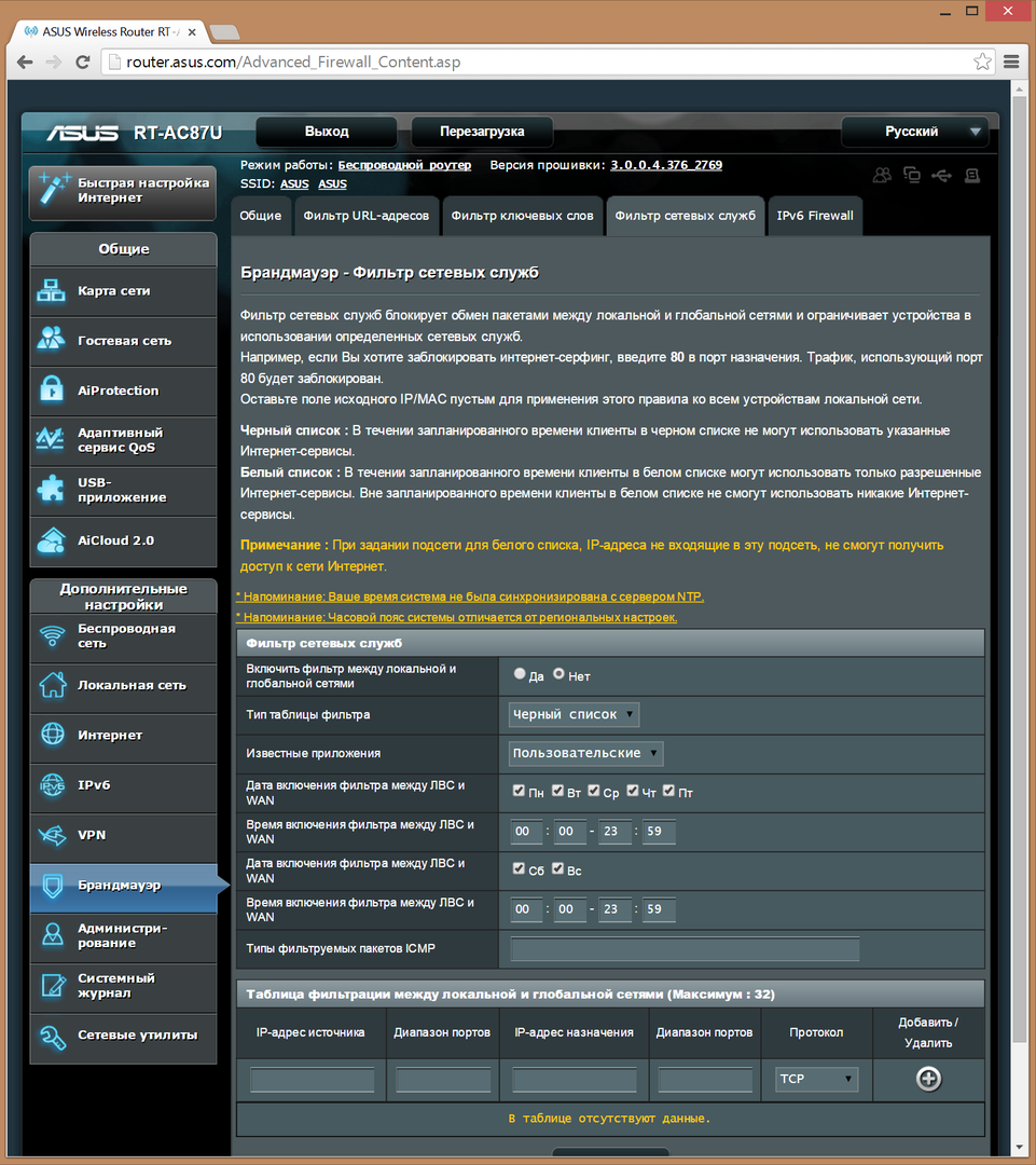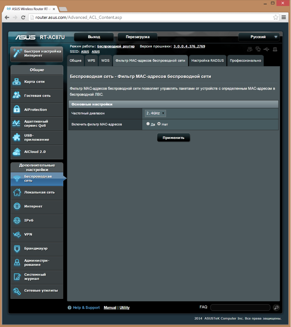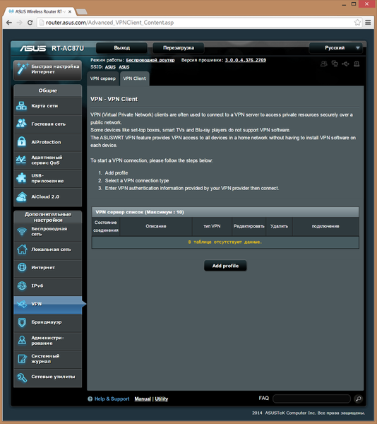 Прошивка всех маршрутизаторов ASUS имеет идентичный дизайн, а также универсальную структуру. С веб-интерфейсом роутеров тайваньской компании вы могли детально познакомиться в обзорах RT-AC68U и RT-AC52U. Поэтому я не буду детально рассматривать каждую функцию, но расскажу про основные возможности. На момент тестирования устройства актуальной считалась прошивка под номером 3.0.0.4.376_2769. Уровень локализации операционной системы на Великий и Могучий можно охарактеризовать как хороший. Хотя есть места, непереведенные на русский язык.