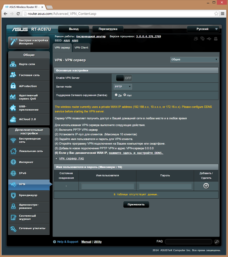 | Поддержка VPN | IPSec Pass-Through PPTP Pass-Through L2TP Pass-Through PPTP server OpenVPN server PPTP client L2TP client OpenVPN client |