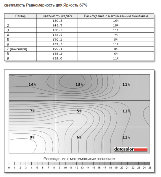 Равномерность цвета средняя, хотелось бы лучшего результата. Верхняя центральная часть экрана по равномерности заметно отличается от нижней части и левого угла на низких значениях яркости. На высокой яркости ситуация меняется на противоположную. Присутствуют также отклонения светимости, блуждающие по экрану на разных уровнях яркости.