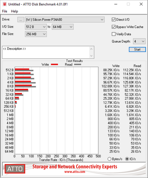 ATTO – это простой замер характеристик SSD в самых «тепличных» условиях при последовательной записи (как если бы вы копировали файлы с одного SSD на другой целой папкой в Windows). Обычно цифры, которые производители указывают на упаковке, берутся именно из результатов этого бенчмарка. Ну и ещё его все любят за то, что в нём удобно поглядывать, как изменяется скорость работы SSD в зависимости от того, насколько крупные файлы вы будете перебрасывать.
