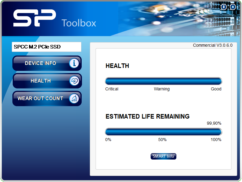 Как это ни смешно, единственная полезная функция в программе – возможность посмотреть значения SMART-атрибутов и поглазеть на строку HEALTH, которая демонстрирует уровень износа накопителя (и то далеко не факт, что делает она это не «от балды»). В общем, никаких специализированных умений SP Toolbox не предлагает, так что не стоит захламлять ей лишние 15 Мбайт на накопителе.