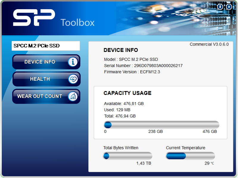 Для работы с SSD предусмотрена официальная софтина SP Toolbox, которую нужно скачивать с официального сайта производителя. В ней есть немного настроек, мониторинг состояния и производительности, и безопасное стирание данных без возможности их последующего восстановления.