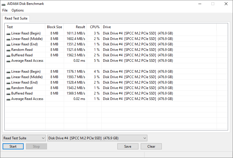 Утилита AIDA64 Disk Benchmark, напротив, оказывается более лояльной и показывает скоростные результаты на уровне CrystalDiskMark. Как итог: 1602,4 Мбайт/с - средняя скорость линейного чтения; 1543,2 Мбайт/с - рандомное чтение данных; 1569,5 Мбайт/с при чтении файлов из буфера.