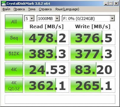 CrystalDiskMark подтвердил наши сомнения по поводу достоверности данных о производительности накопителя. Уровень быстродействия при последовательной записи не превышает 378 Мбайт/с. Аналогичный результат получается при запуске теста случайной записи с блоками по 512 Кбайт. Значения скорости для последовательного и случайного чтения не превышают 482 Мбайт/с и 389 Мбайт/с соответственно. Наиболее низкие результаты накопитель показал в тесте случайного чтения/записи 4-килобайтных блоков с глубиной очереди, равной единице. Максимальные показатели составили 25 Мбайт/с при чтении и 99 Мбайт/с при записи соответственно. При изменении глубины очереди до 32 значения скорости чтения практически соответствуют уровню случайной записи блоками 512 Кбайт с наивысшим показателем 378 Мбайт/с. А вот скорость записи явно «хромает»: всего лишь 283 Мбайт/с. Результаты на порядок хуже менее дорогого OCZ Vertex 450.