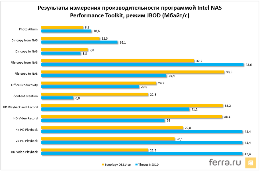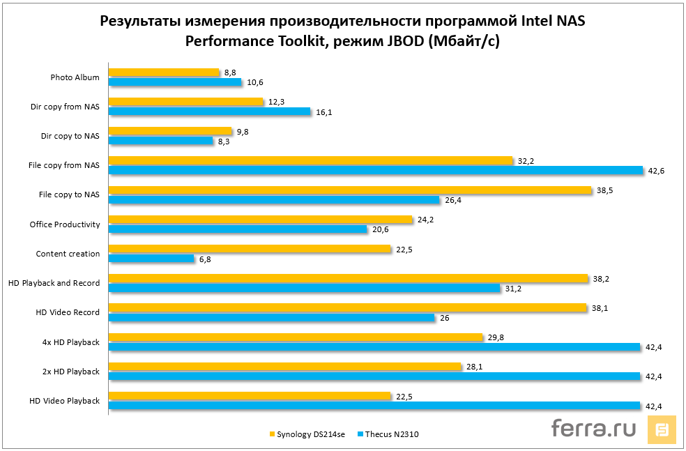 Сетевое хранилище Thecus N2310 имеет не самый быстрый процессор в своём классе, однако его производительности вполне достаточно для домашнего использования. Ещё три года назад аналогичные результаты в бенчмарках показывали устройства классом выше. Следовательно, мы наблюдаем прогресс не только в плане роста функциональности, но и быстродействия.